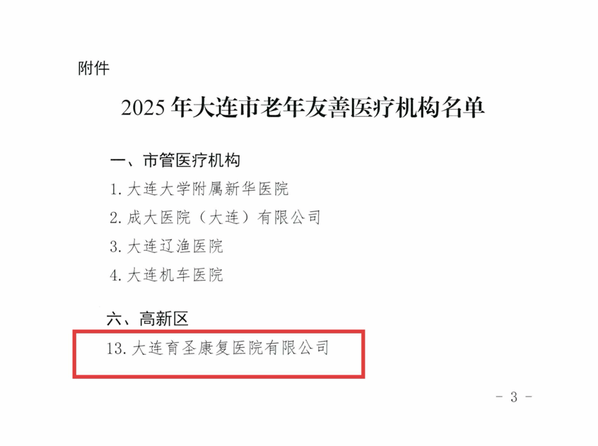 06-30/2025我校附属康复医院获评“2025年大连市老年友善医疗机构”近日,大连市卫生健康委员会发布了《关于公布2025年大连市老年友善医疗机构名单的通知》,我校附属康复医院成功获评“2025年大连市老年友善医疗机构”,并由市卫健委推荐至省,获得辽宁省老年友善医疗机构的参评资格。标志着医院在提升老年患者就医体验、构建尊老敬老爱老医疗环境方面取得的成效,获得了政府部门及行业的高度认可。医院始终将“老年友善”理念融入医疗服务的各个环节:环境设施适老化:无障碍通道、清晰标识、舒适的候诊区、... -